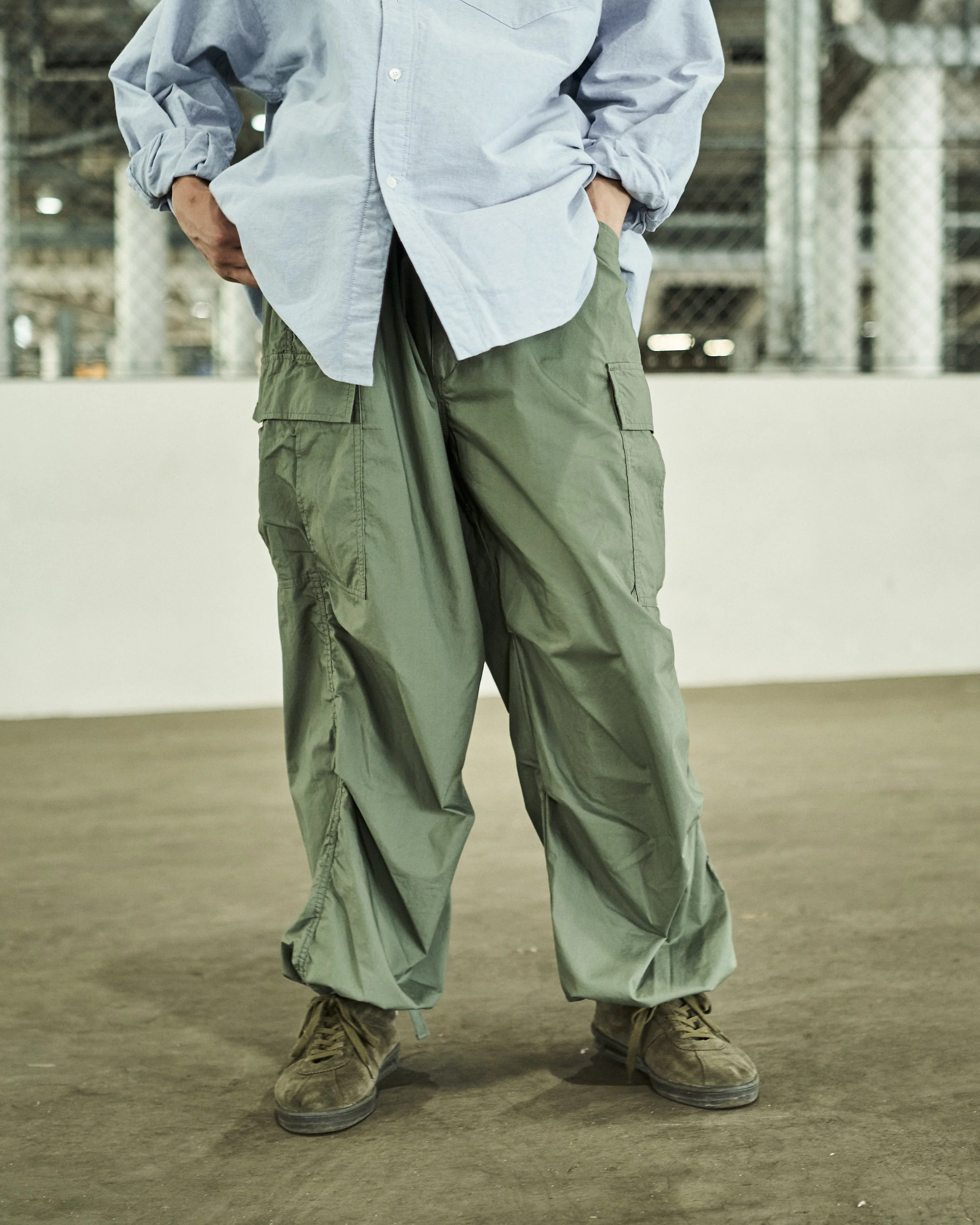 FreshServie's updated version of the M65 field pant, which has a very thick, straight silhouette from the hip area to the hem and is full of characteristic details. The use of tape and buttons for attaching and detaching the liner in details follows the military style, while the unique puckering and airy three-dimensional atmosphere is expressed by sewing two layers of light and supple high-density typewriter cloth as a single piece. A new color, TAN, is now available.